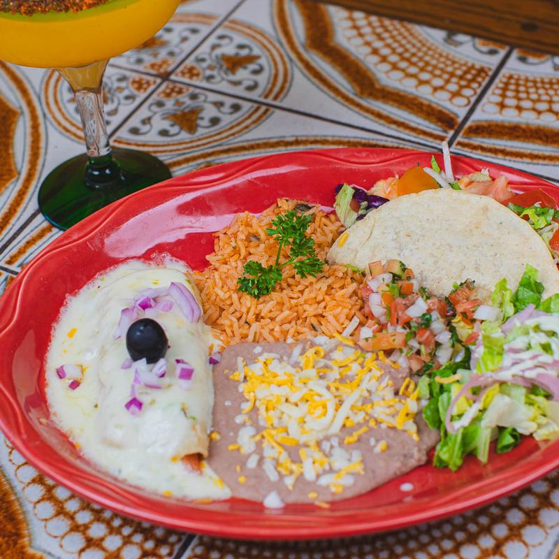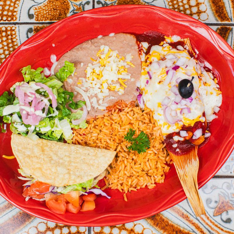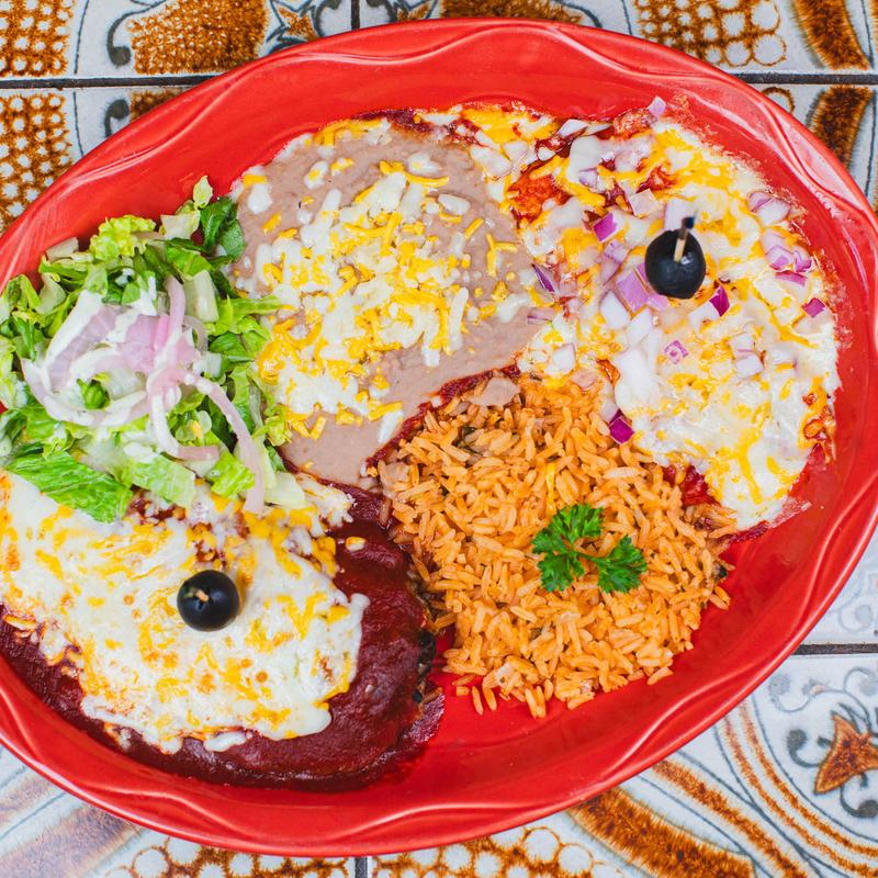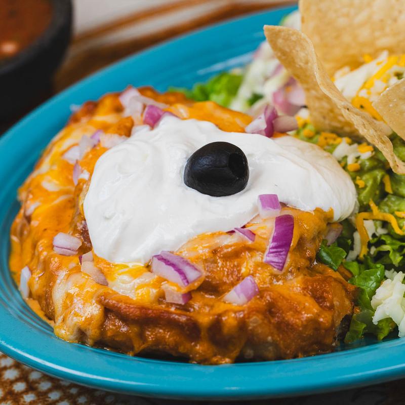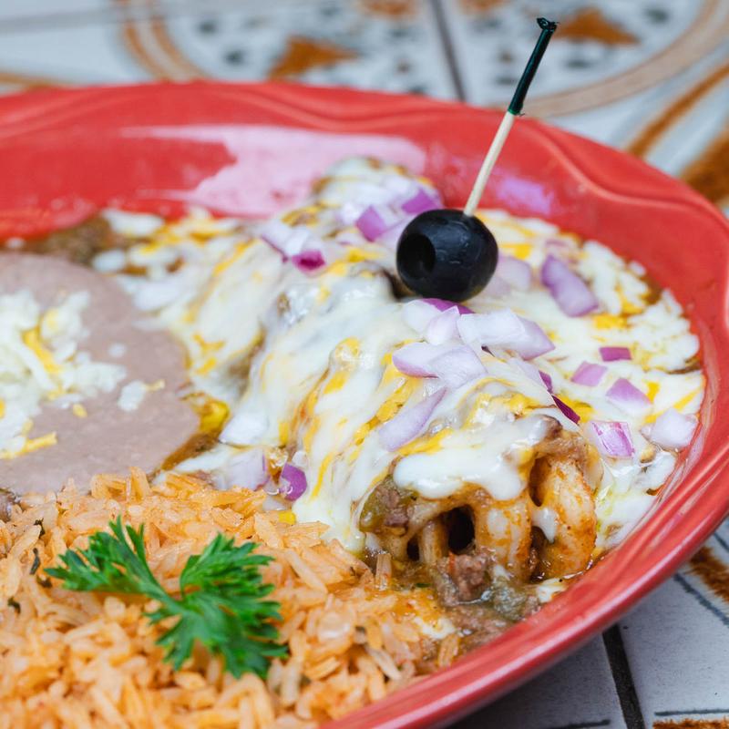 Hand rolled sopapilla masa wrapped around your favorite filling, then deep fried, served exchilack styk topped with red or green chik sauce, cheese, & onions. Choose guacamok salad or rice and beans, with sour cream.